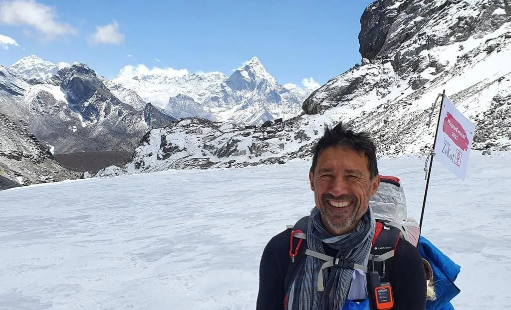 Pascal Denoël, dirigeant du groupe angevin Zekat, pose devant le sommet de l’Everest. © Zekat