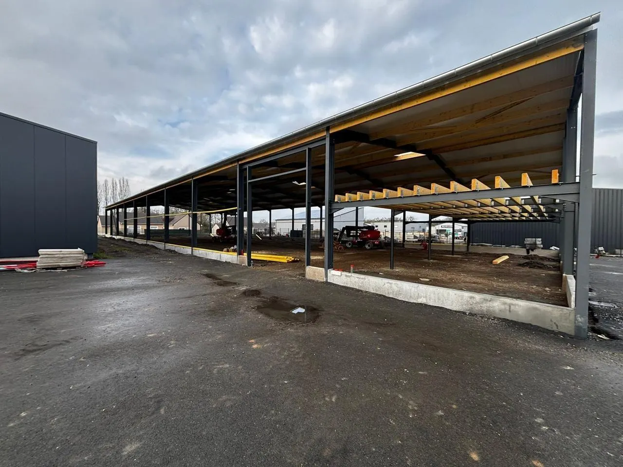 Le bâtiment de l’entreprise CM Services à Bécon-les-Granits, totalement détruit en décembre 2024, est en pleine reconstruction. © CM Services
