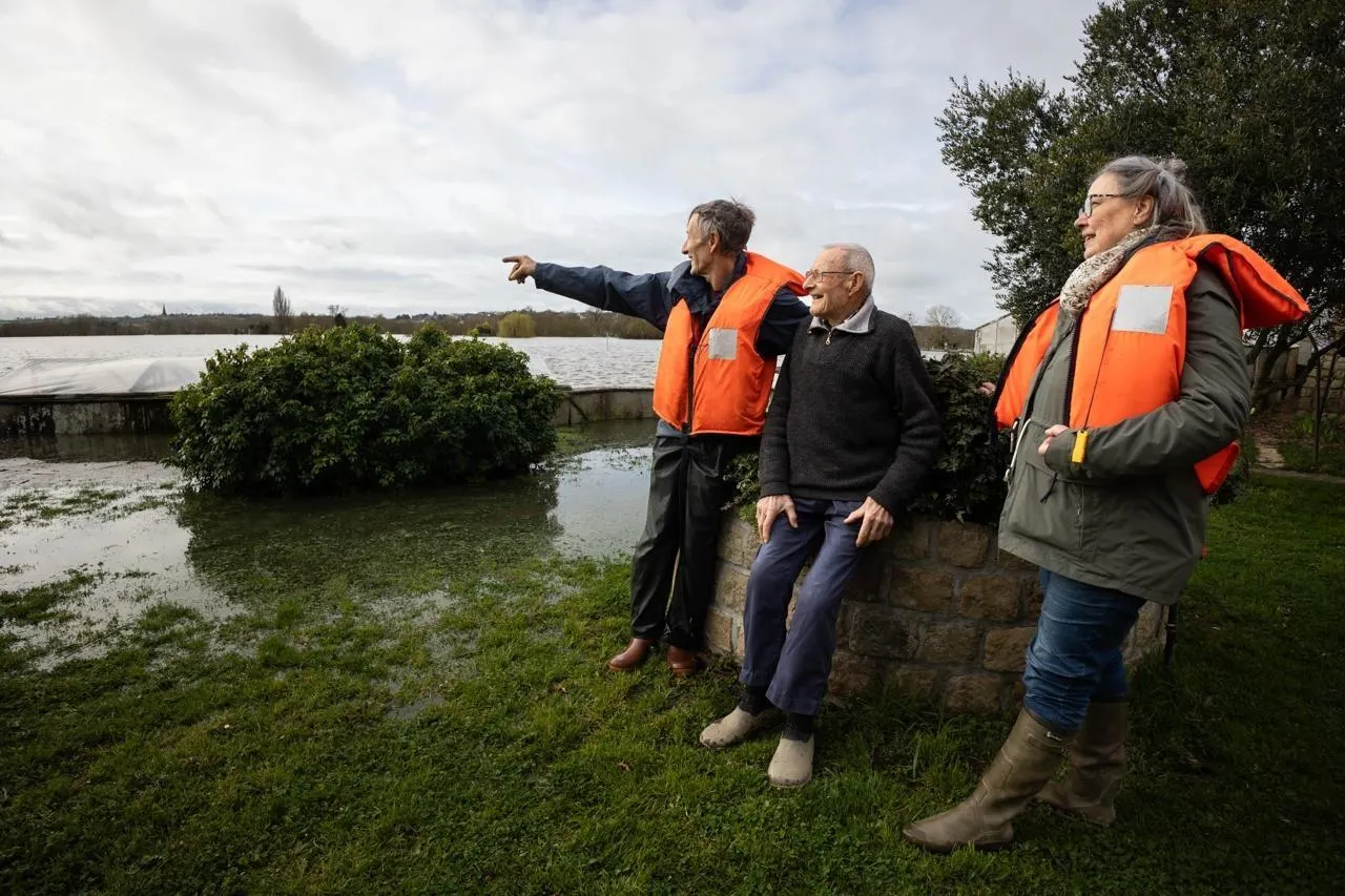 Chalonnes-sur-Loire, hameau de Cordé, dimanche 22 février 2026. Jean-François et Maryse Cogné entourent Jean Cogné, 94 ans. Le doyen de l’île vit dans ce secteur inondable depuis sa naissance. © CO - Régine Lemarchand