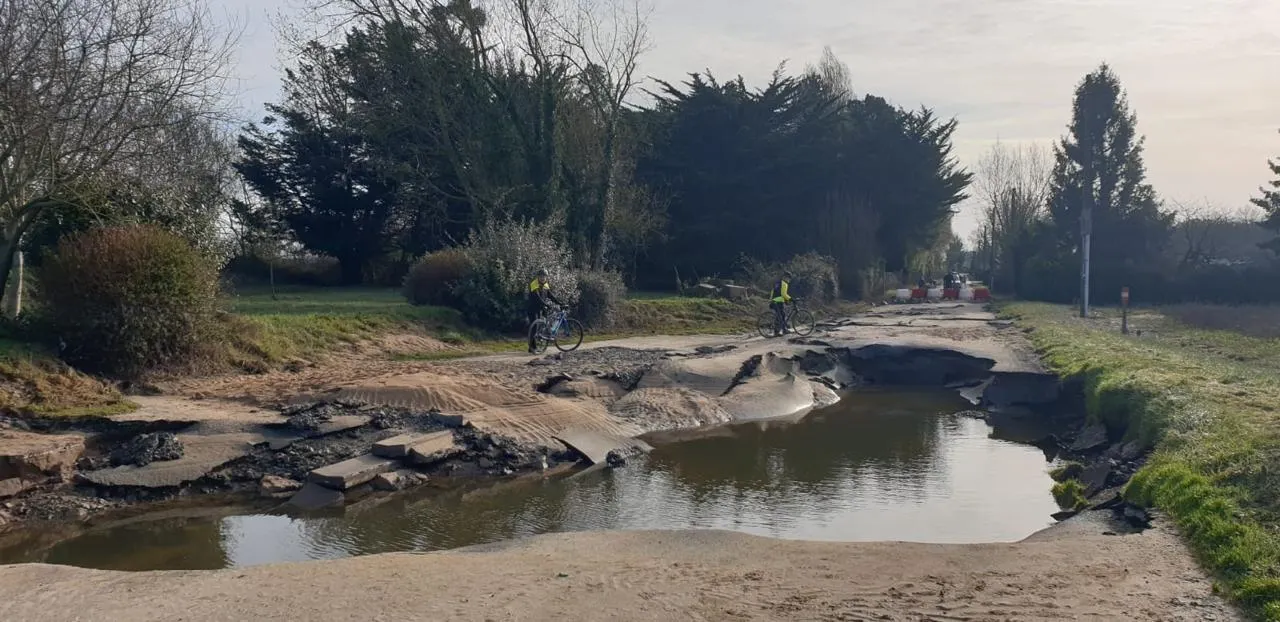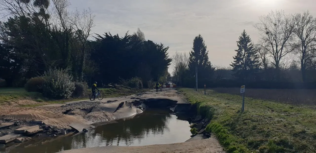 Entre Les Ponts-de-Cé et Juigné-sur-Loire, une crevasse a perforé la départementale, suite à la crue de la Loire © Vélo Club Madeleine