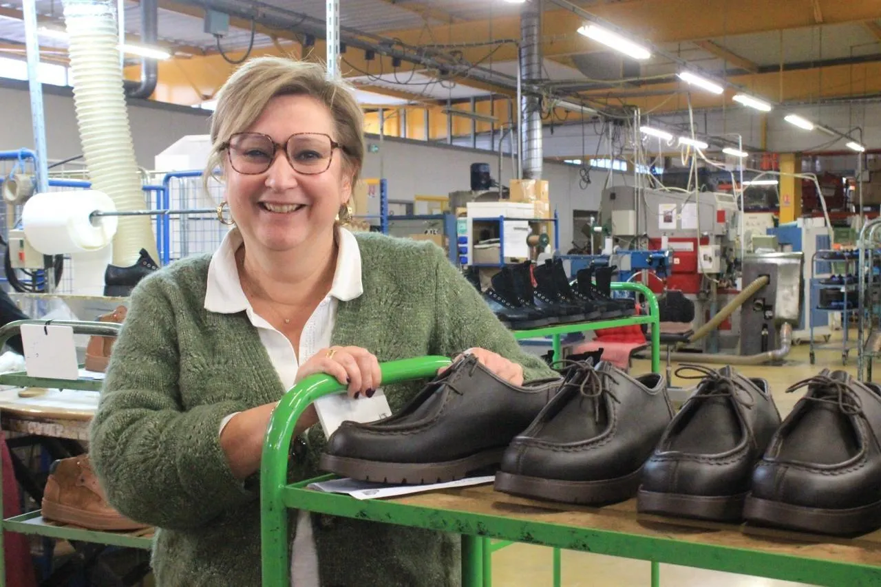 La Romagne, jeudi 27 novembre 2025. Avec les chaussures Kleman (au premier plan), Emmanuelle Cléon et son entreprise détiennent « une pépite » qui plaît à l’étranger. ©  CO - Alexandre BLAISE