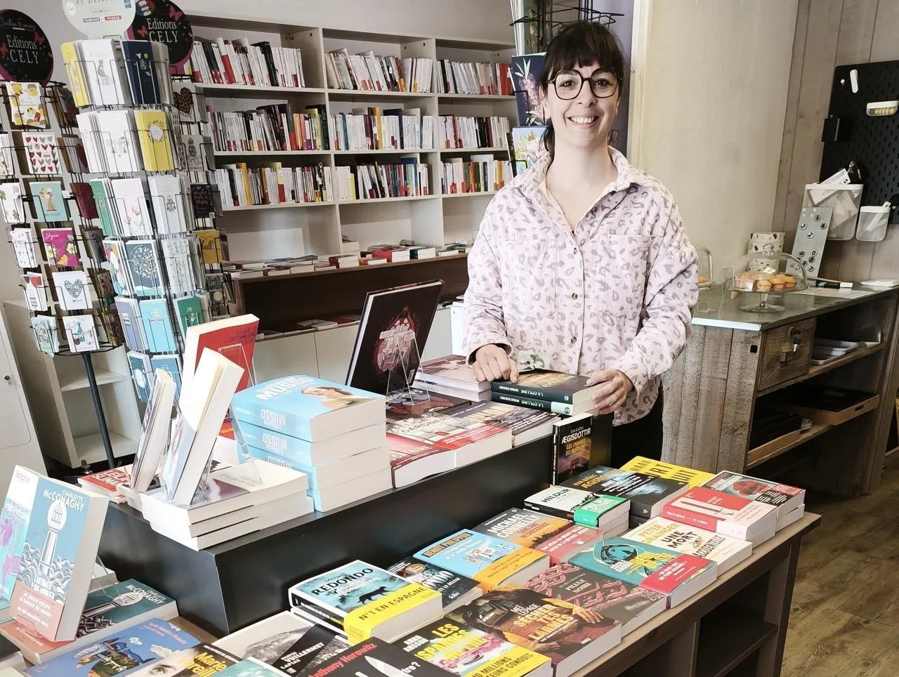 Depuis début mars, la nouvelle libraire a pris ses fonctions, dans ce lieu convivial où les visiteurs peuvent rester, à l’intérieur de la boutique ou en terrasse. On peut y prendre un café, un thé ou encore trouver des gourmandises ou produits locaux. Le bilan de ce premier mois est très positif. J’ai reçu un accueil chaleureux des clients locaux qui apprécient que ce lieu reste une librairie. Ça me plaît beaucoup de pouvoir partager et échanger autour du livre.