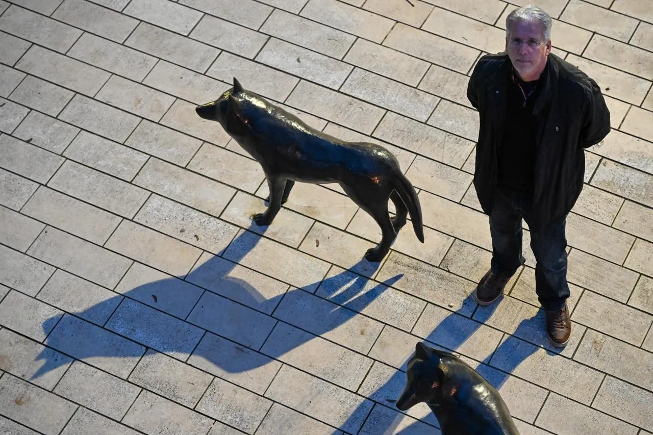 Angers, 16 décembre 2025. Pierre-Louis Augereau au milieu des loups sculptés par l’artiste Roland Cognet, place Giffard-Langevin. © CO - Laurent COMBET