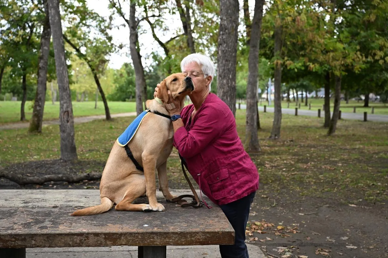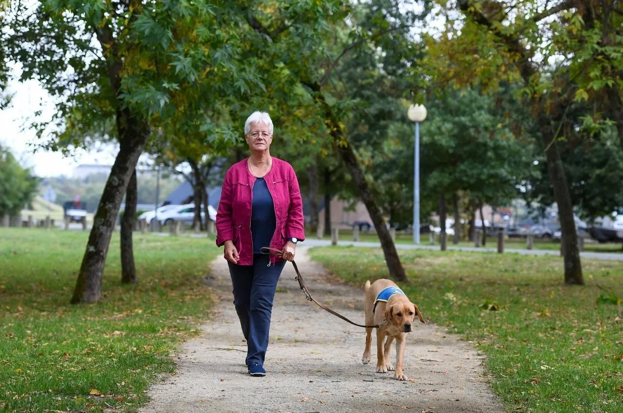 Angers, Lac de Maine, 4 septembre 2025. Vally et Anne Gudin, une complicité qui va durer deux ans. Le temps d’éduquer cette chienne qui accompagnera ensuite, au quotidien, une personne atteinte de déficience visuelle. © CO – Josselin CLAIR