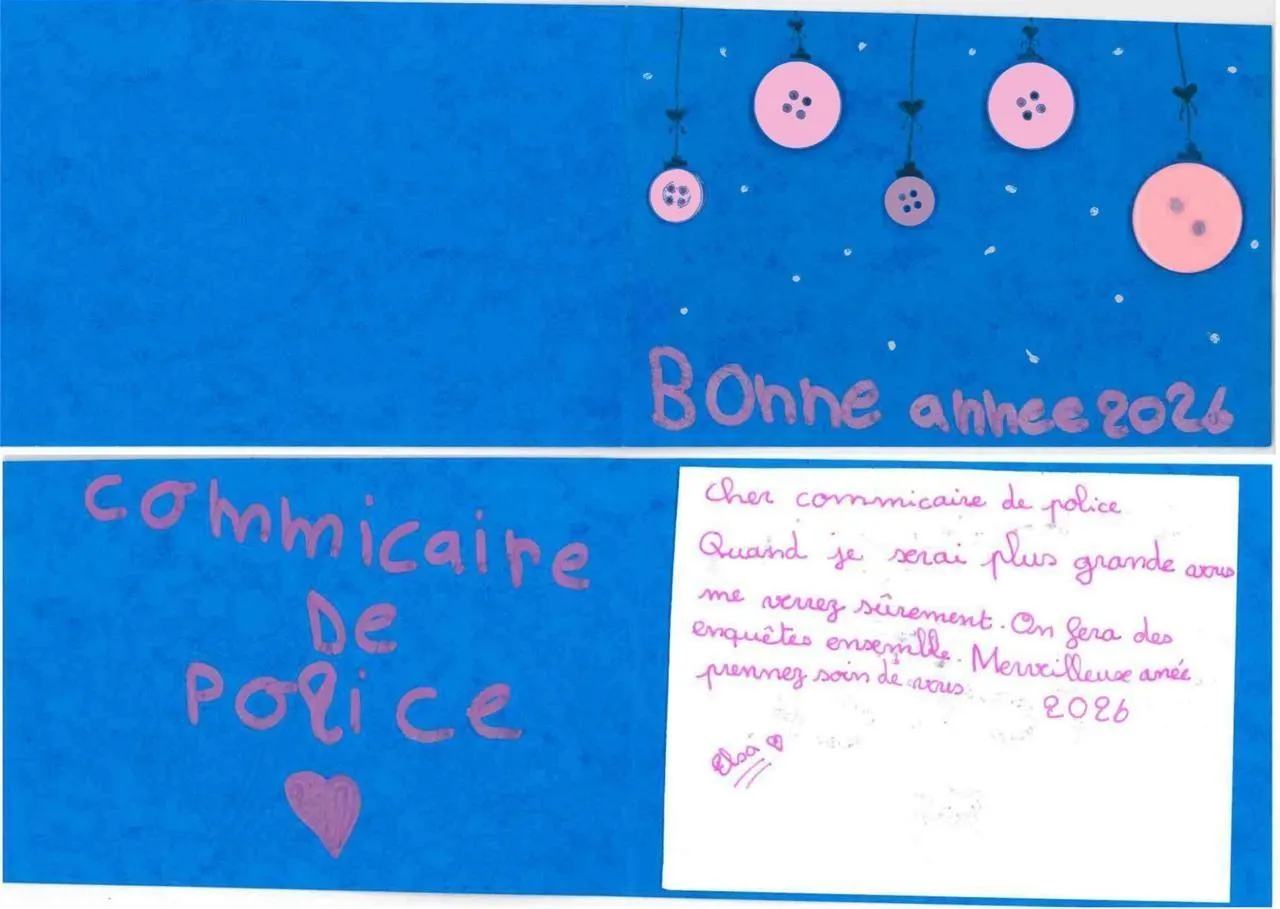 , mais on pardonnera l’orthographe, la jeune fille souhaite une bonne année aux policiers, mais pas seulement. Elle écrit aussi  quand je serai plus grande, vous me verrez sûrement, on fera des enquêtes ensembleÂ