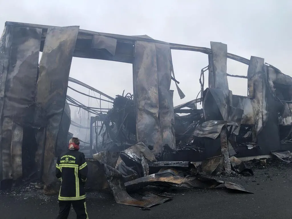 L’entrepôt de 1 200 m² de CM Services, à Bécon-les-Granits, a été entièrement détruit par le feu. © CO