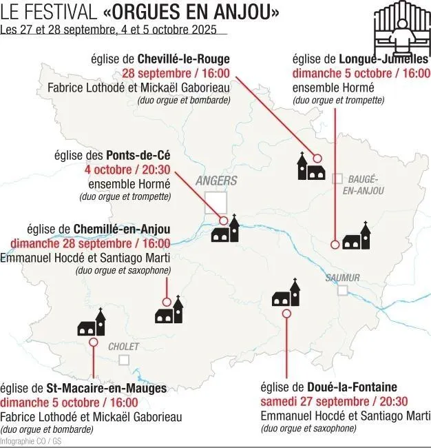 Organisée dans six communes de Maine-et-Loire, la 4e édition d’Orgues en Anjou fait évoluer son format sur deux week-ends : les 27 et 28 septembre et 4 et 5 octobre 2025. Trois formations musicales se produiront dans les églises pour mettre en valeur les orgues du territoire rural.