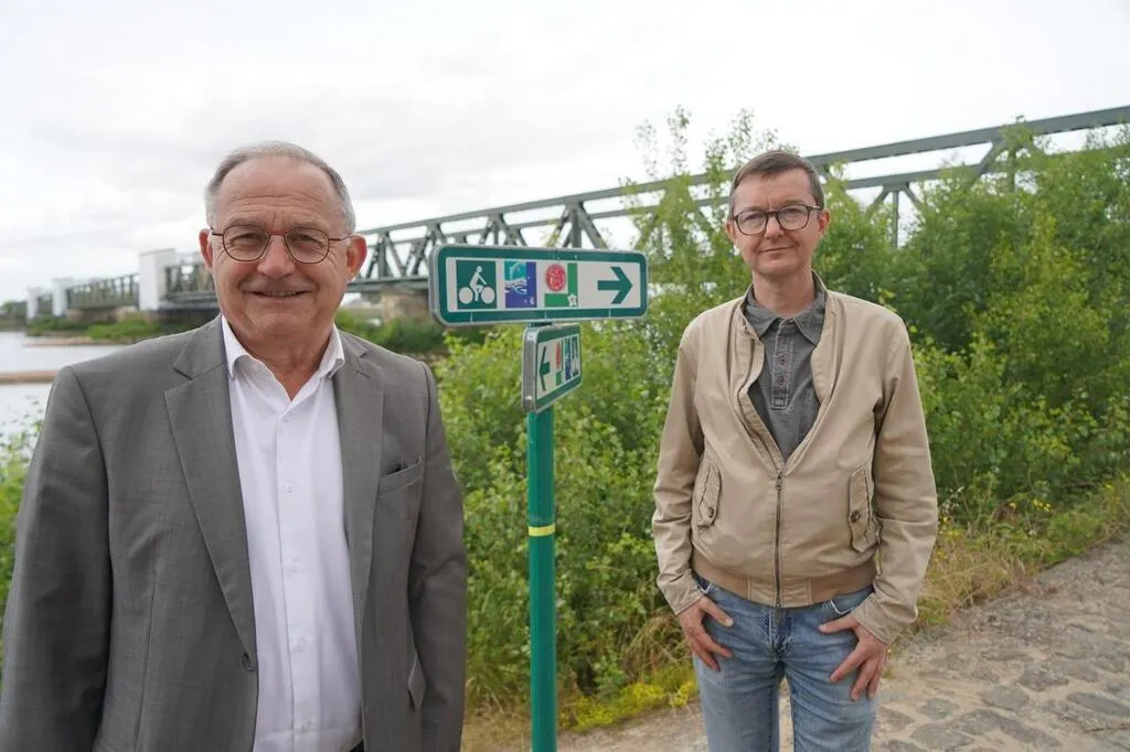 « Le pont est très fréquenté par les cyclistes de la Loire à vélo et de la Vélofrancette », rappelle Gilles Piton, vice-président du Département en charge des routes, ici accompagné de Stéphane Lefebvre, responsable des ouvrages d’art à la direction des routes. © Ouest-France