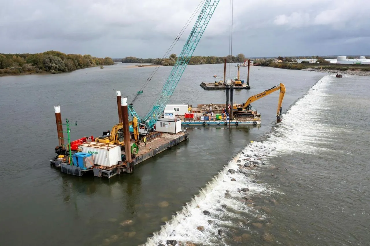 Au cours des travaux de rééquilibrage du lit du fleuve la Loire, des barges équipées de pelleteuses ont ajouté de la roche aux épis rocheux qui avaient disparu avec les courants. © Franck Dubray