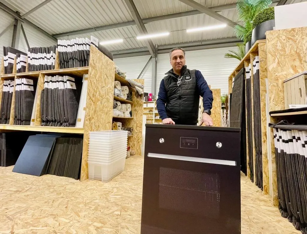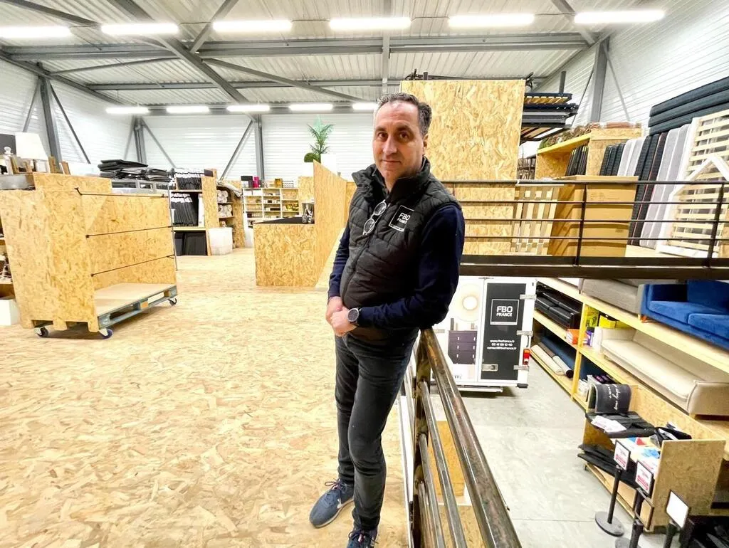 Alexandre Soulié, 52 ans, le patron de FBO France, dans son local de Saint-Barthélemy-d’Anjou. Devant lui, un four factice qui fait partie d’une cuisine, tout aussi factice, pour compléter la déco d’appartements témoins. © Ouest-France