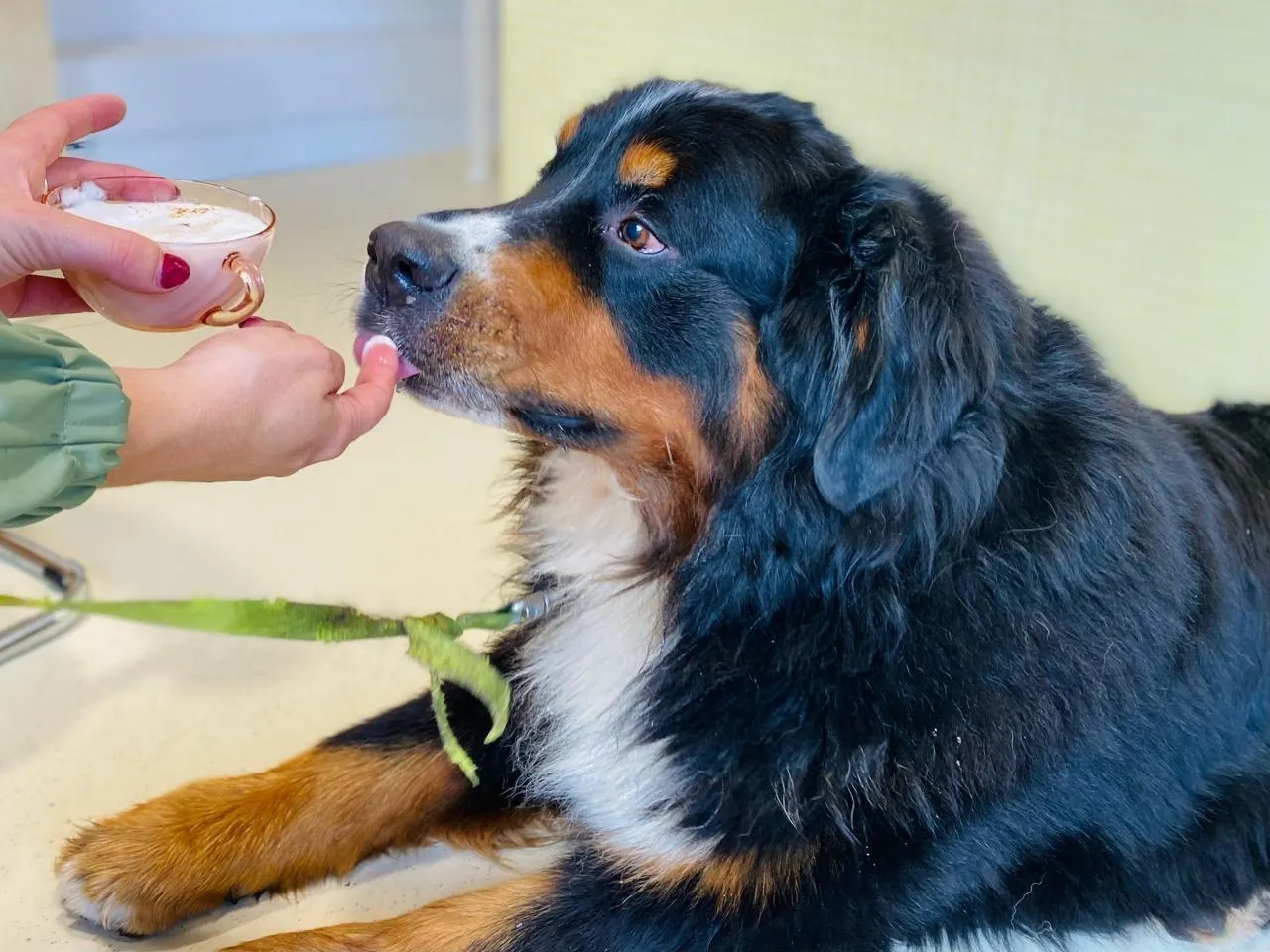 Le Bouvier bernois Power léchouillant un "Clebs latte" dans le concept store du même nom à Rennes. © Charlotte Hervot