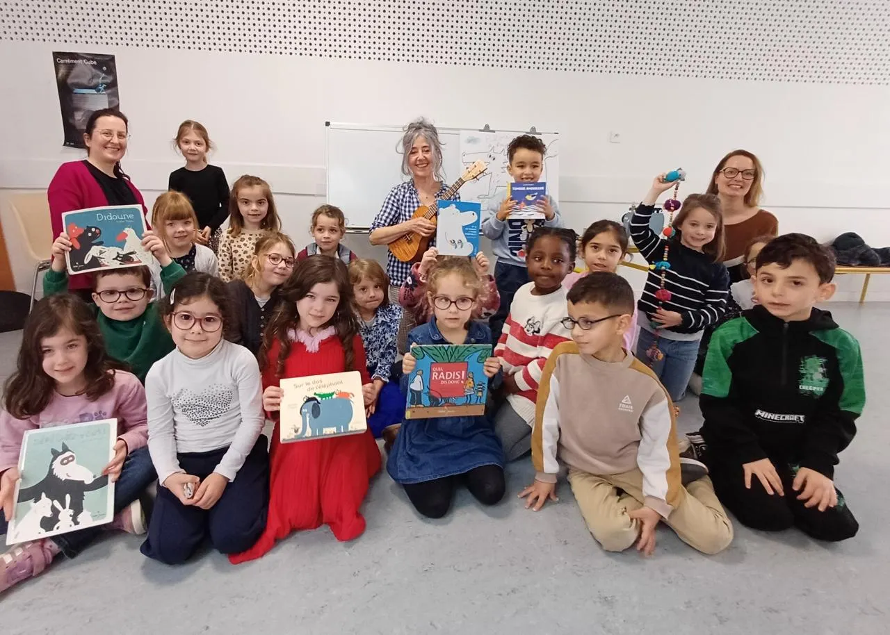« Du 3 au 6 mars, j’ai proposé des ateliers rencontres pour les élèves de 3 à 6 ans. J’ai évolué tout doucement, pour proposer aujourd’hui des spectacles plus diversifiés. Depuis 2 ans, j’ai ajouté une chanson qui me permet d’associer le ukulélé à mes textes. Les rencontres avec les enfants m’ont amené à proposer un spectacle complet autour de mes albums. Je conte, chante, m’accompagne en musique et même dessine les personnages de mes albums en live.