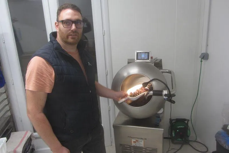 Devant sa turbine d’enrobage de chocolat, Flavien Bondu présente le fruit de son travail. © CO