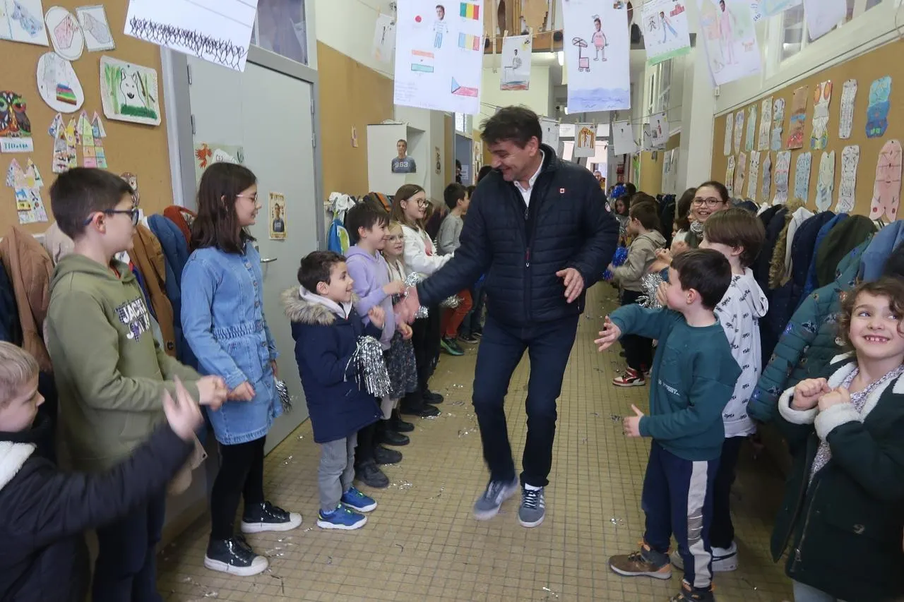 La Ménitré, vendredi 13 février 2026. Pour le dernier jour de Bruno Bellanger, directeur de l’école Maurice-Genevoix pendant 20 ans, les élèves ont fait une haie d’honneur. © CO - Agathe Le Nueff