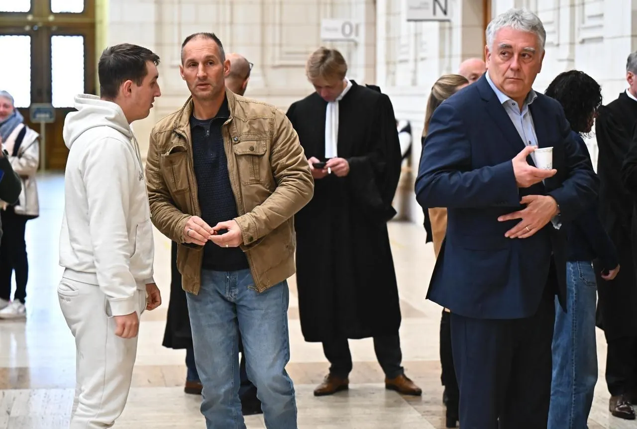 Bryan et Sébastien Mandote, frère et père des victimes, derrière Gilles Bourdouleix, maire de Cholet (Maine-et-Loire), dans la salle des pas perdus du tribunal correctionnel d’Angers. © Franck Dubray / Ouest France