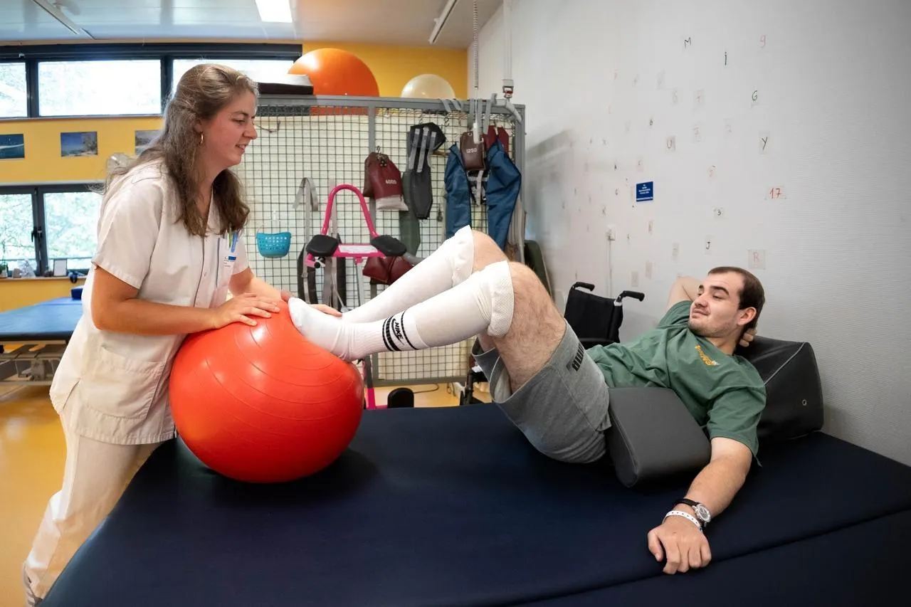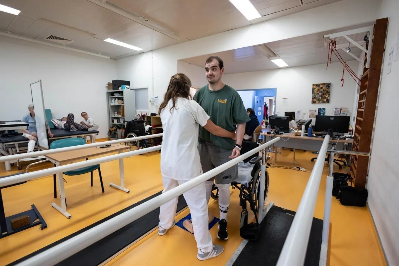 Angers, boulevard Jean-Sauvage, 12 septembre 2025. Dans la salle de kinésithérapie du centre de rééducation des Capucins, où il est hospitalisé depuis le 25 mars, Alban réapprend à se tenir debout, premier objectif avant de remarcher. © CO - Régine LEMARCHAND