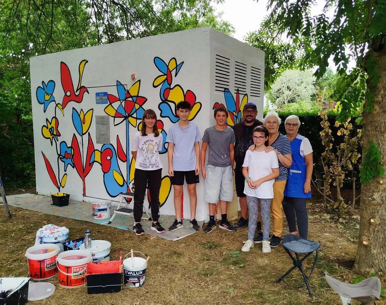 Jeunes et aînés entourent l’artiste David (alias Paf le Piaf) et leur œuvre commune en cours. Le transformateur se trouve avenue du Champs-Fleury, dans le quartier de la Grange-aux-Belles, où il sera inauguré. © CO