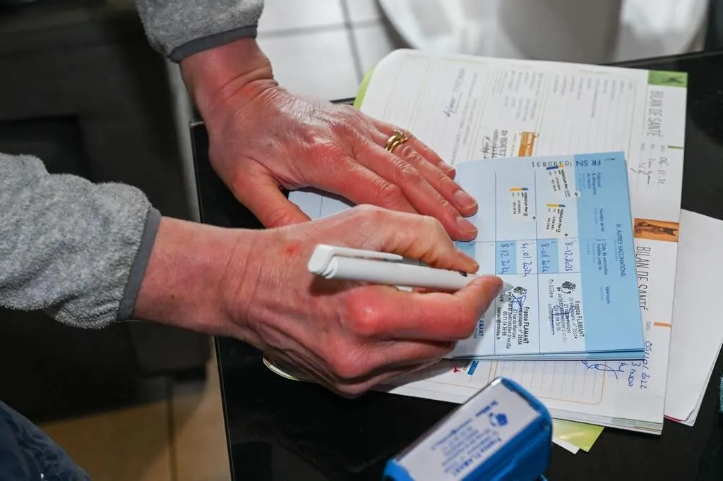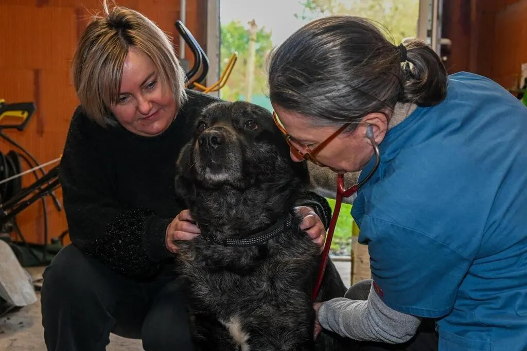 Les Alleuds (Brissac-Loire-Aubance), vendredi 3 janvier 2025. Christelle rassure son chien Oslo, croisé labrador et berger australien, tandis que le Dr Flamant se prépare à l’examiner, chez lui, dans un espace qui lui est familier. © CO – Laurent COMBET