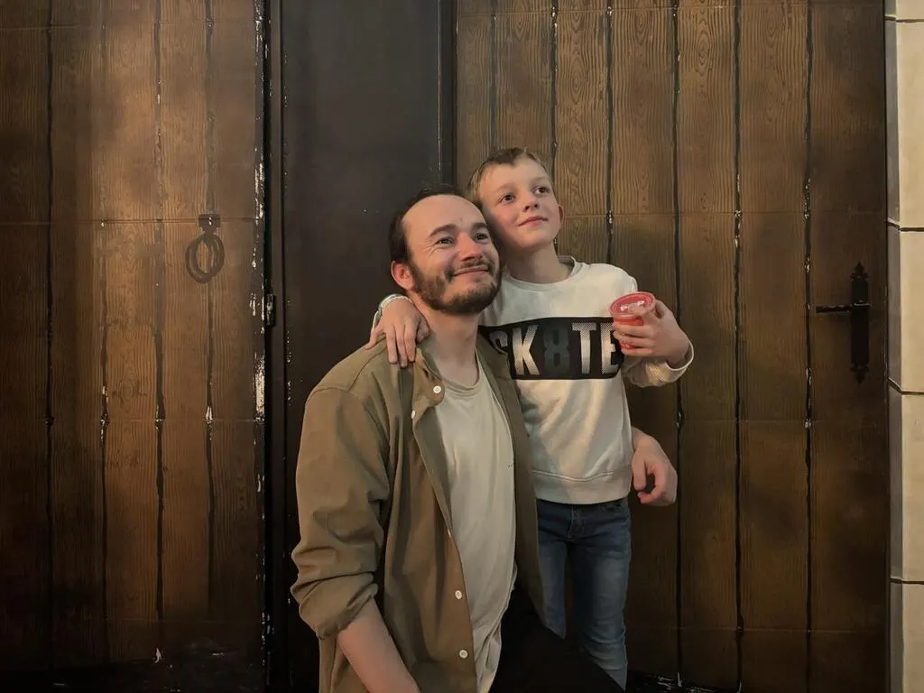 Benoît, maestro de « N’oubliez pas les paroles », avec Gabriel, 9 ans, lors de la soirée karaoké, près d’Angers. © Ouest-France