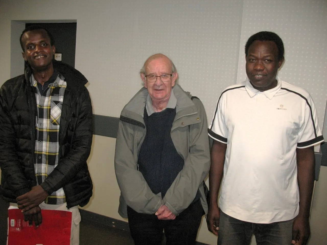Moussa, Alain Cavaillé et Omar devant les collégiens du Lion-d’Angers. © CO