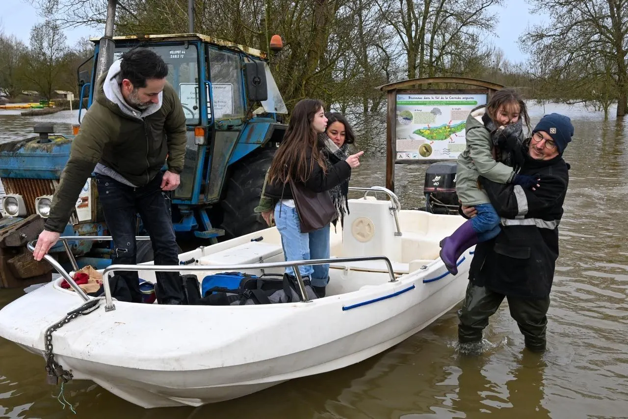 À Rochefort-sur-Loire (Maine-et-Loire), ce lundi 16 février 2026 au matin, le Louet et la Loire ne font plus qu’un. Une vaste étendue d’eau, à travers arbres et bâtiments submergés, à perte de vue. Au pied de Rochefort, le Louet, rivière devenue fleuve, lèche le pied des premières habitations. L’accès au pont qui mène à la Vallée de la Loire et Béhuard est fermé à la circulation. Un tracteur le traverse néanmoins, halant l’un des nombreux mobile homes évacués du camping inondé. Des piétons, curieux, s’aventurent jusqu’à la guinguette du Port Gogane et la piscine du Louet. Impossible d’aller plus loin.