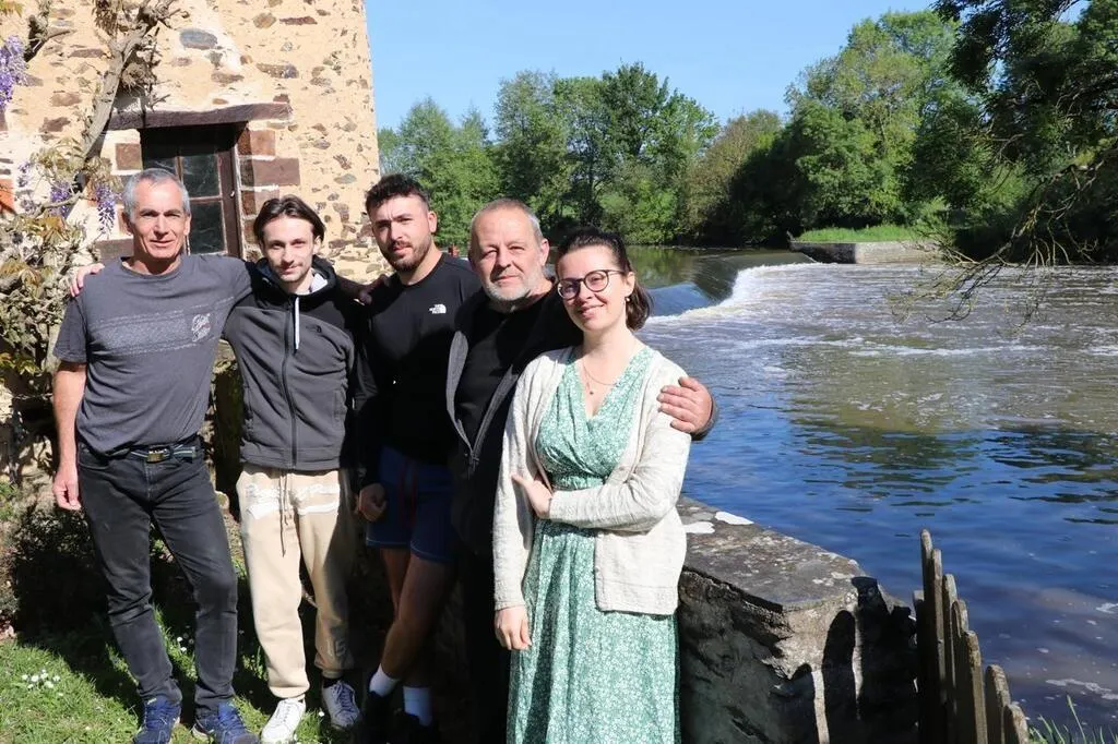 Benoît Bader, Elie Maussion, Ulysse Bader, Laurent et Marie Maussion (de gauche à droite) devant le barrage où ils ont porté secours à trois personnes risquant la noyade. © Ouest-France