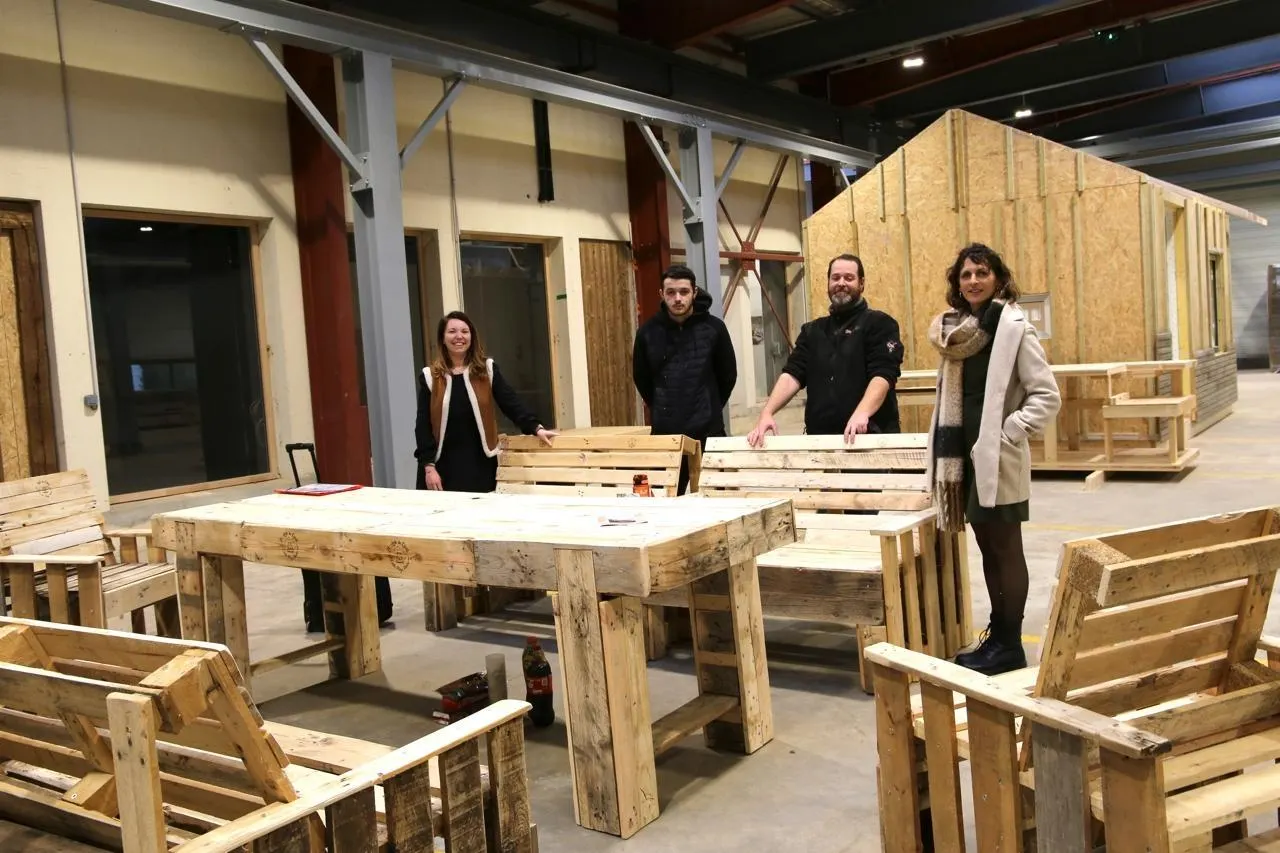 Léo Le Neillon avec, à sa droite Jessica Michaud, directrice de Forma.Clé, et à sa gauche Cédric Huellou, formateur technique, et Aline Carré, conseillère à la Mission locale, derrière le salon d’extérieur réalisé en bois de récupération dans les locaux de Synergie, à Montrevault-sur-Èvre. © Ouest-France