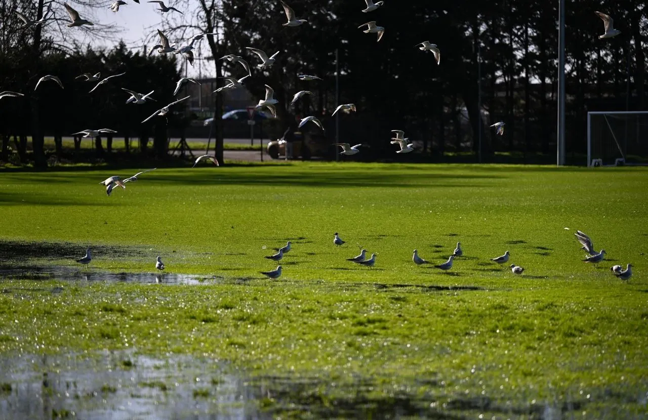 Angers, le 24 février 2026. Des mouettes rieuses rassemblées sur les terrains de foot d’entraînement d’Angers SCO inondés. © CO - Josselin Clair
