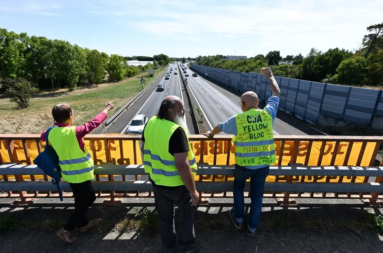 Verrières-en-Anjou, samedi 23 août 2025. D’anciens gilets jaunes déploient des banderoles sur un pont surplombant l’autoroute A11. © CO - Josselin CLAIR