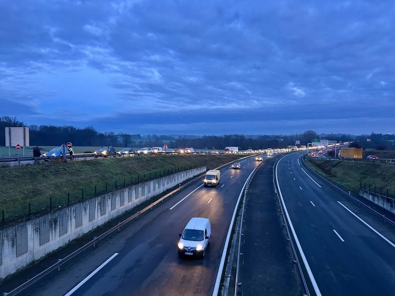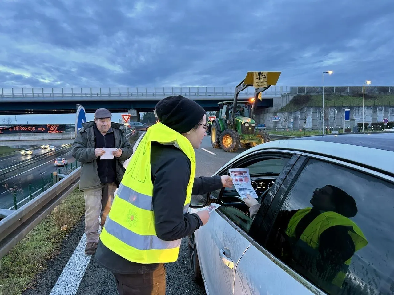 Beaucouzé, mardi 23 décembre 2025. Pauline, éleveuse à Bouchemaine, distribue des tracts aux automobilistes, à proximité de l’A11. © CO - Chloé BOSSARD