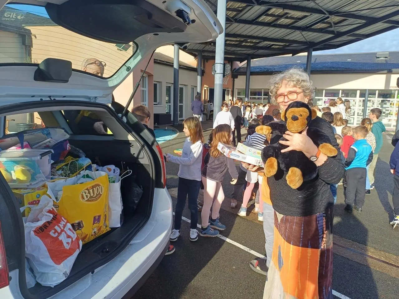 Christine Métay : « Dans un premier temps, l’école s’est mobilisée pour recevoir des dons de jouets provenant des familles et des enfants. Aujourd’hui, lundi 8 décembre, je viens prendre possession de ces dons. J’explique ce que sont les Restos du cœur aux 150 écoliers par des échanges fructueux. Merci aux écoliers pour leurs dons. La solidarité se prolonge par une chaîne humaine de transport des cadeaux jusqu’à ma voiture, puis au volant. Je roule désormais direction le centre trélazéen des Restos du cœur. »