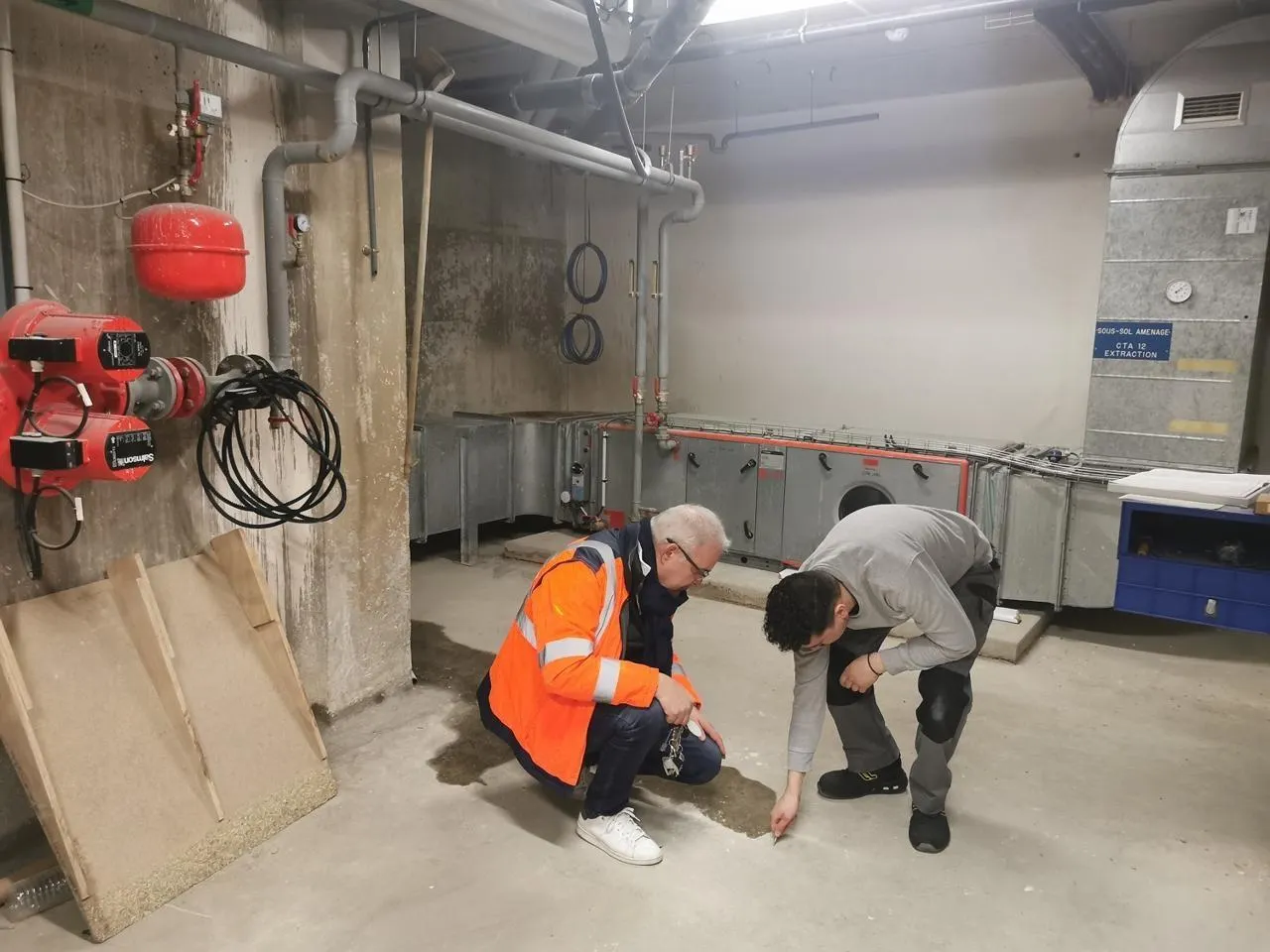 Christophe Biret, coordinateur des ateliers de maintenance et Maxime Sorin, adjoint au responsable atelier fluide au CHU lors d’un contrôle bâtimentaire dans un sous-sol hospitalier, ce mardi 17 février. © Photo CHU ANGERS