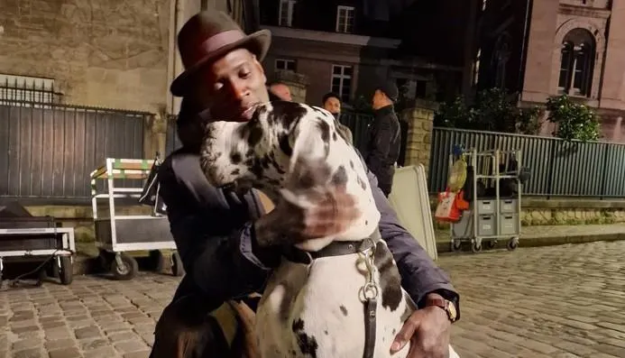 Omar Sy avec la chienne Roazhon, lors du tournage du film « French Lover », à Paris. © Valérie Dreumont