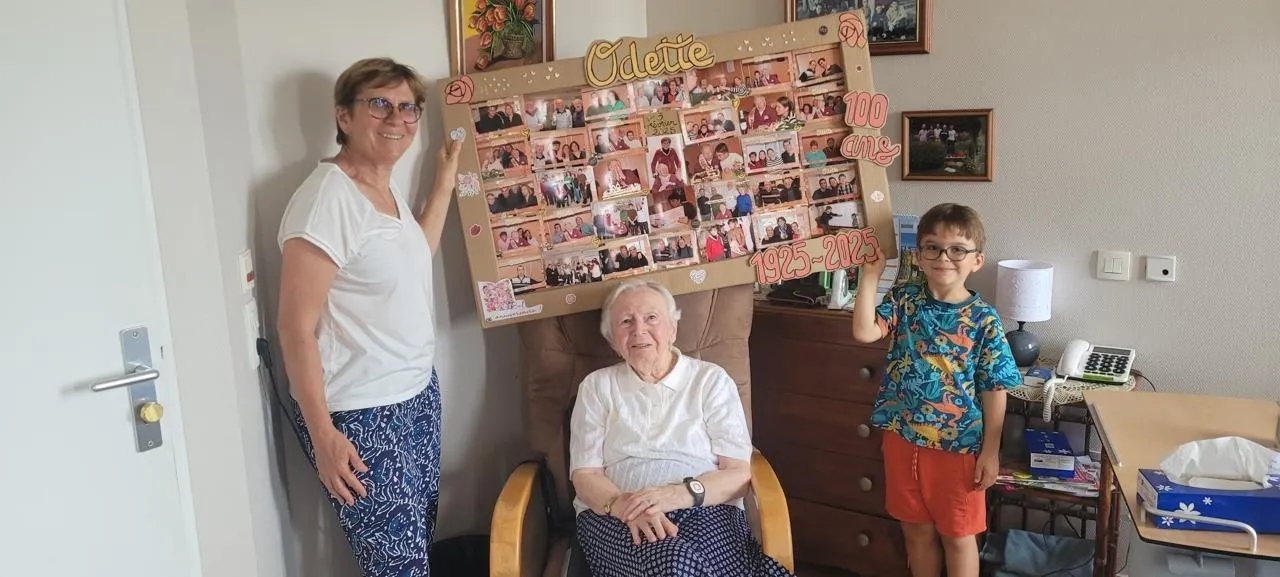 Odette (au centre) a fêté son centième anniversaire en février 2025. Une longévité qui rend fière sa famille. © Ouest-France