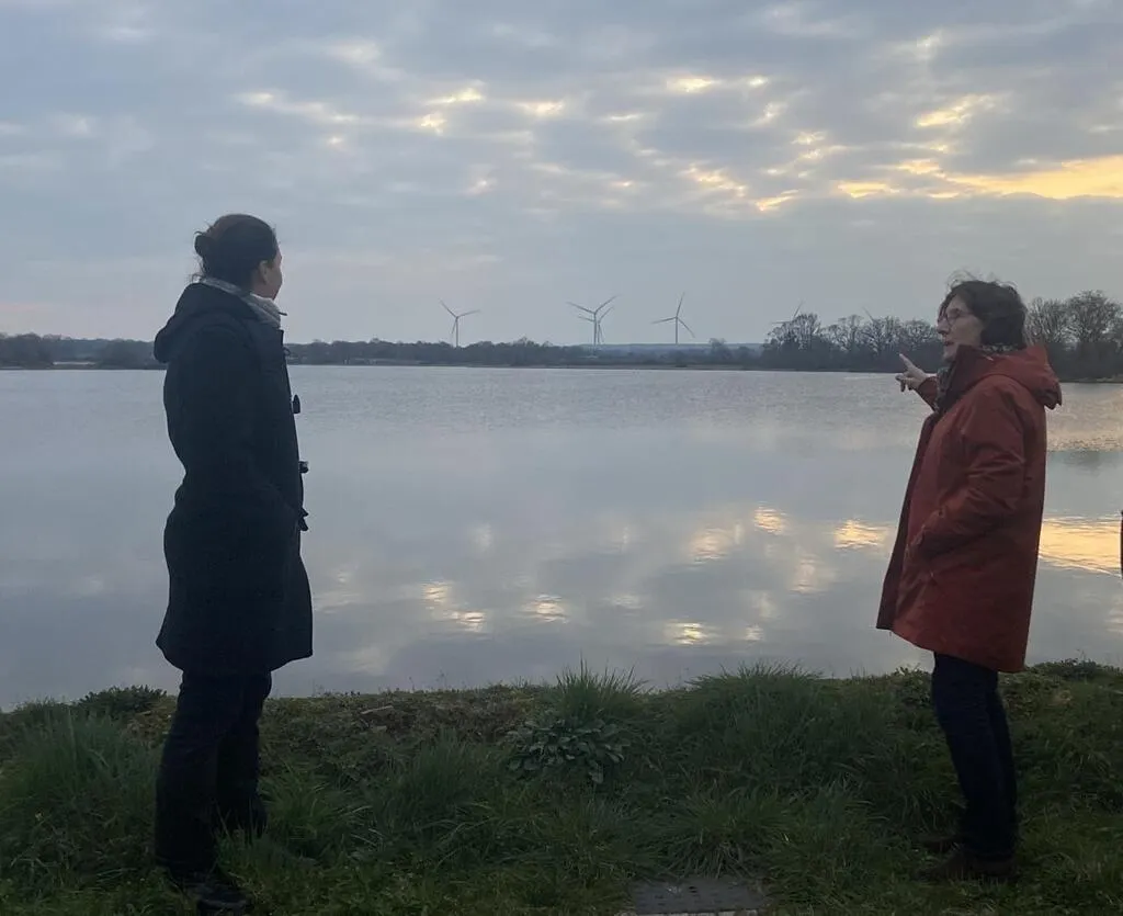 Depuis l’étang de Beaurepaire, Alizée Thusy et Marie-Thérèse, opposantes au projet, observent l’horizon déjà marqué par la présence d’éoliennes. © Ouest-France