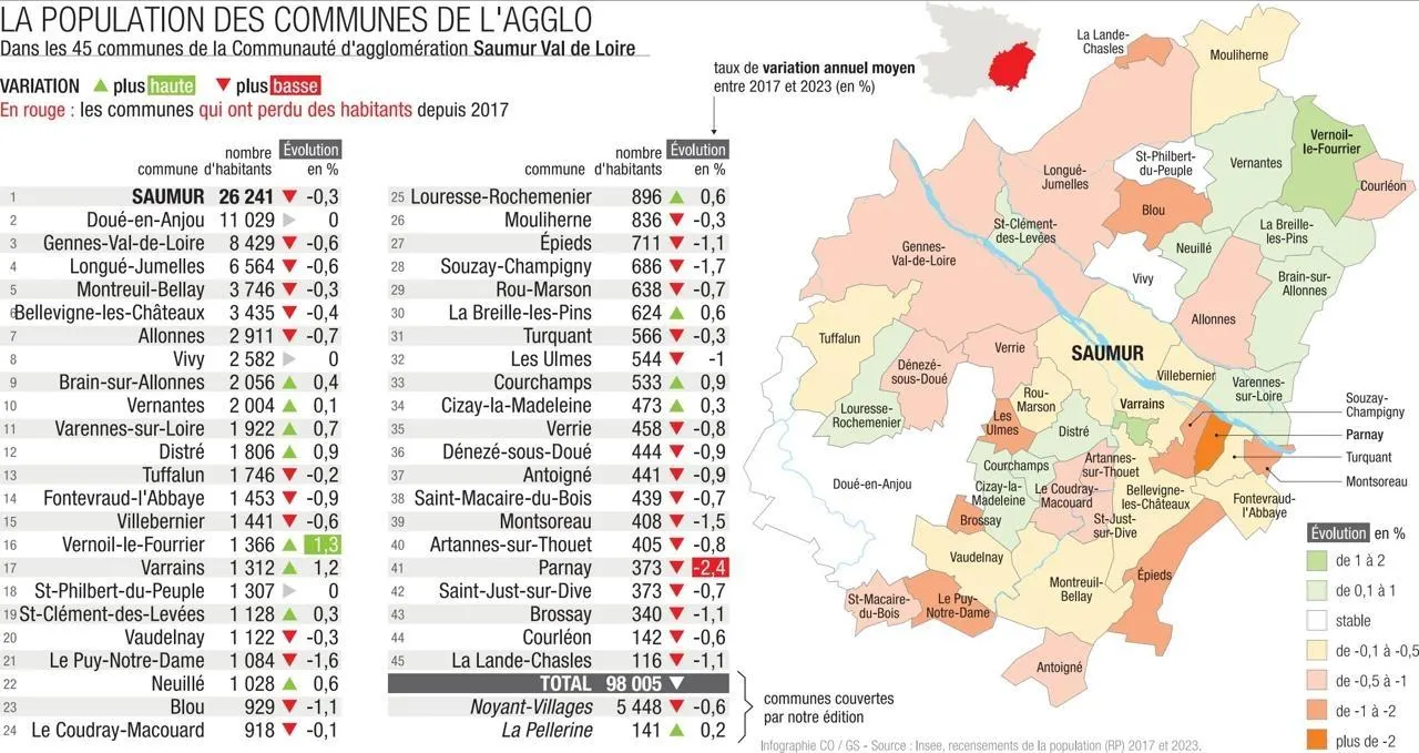 La tendance se traduit à chaque livraison annuelle des chiffres de l’Insee : l’est du Maine-et-Loire perd des habitants. L’Agglomération Saumur Val de Loire, comptait officiellement 98 005 habitants en 2023 (donnée référence pour 2025), contre 98 377 en 2020. Si Doué surnage (idéalement placée et desservie au carrefour d’Angers, ...