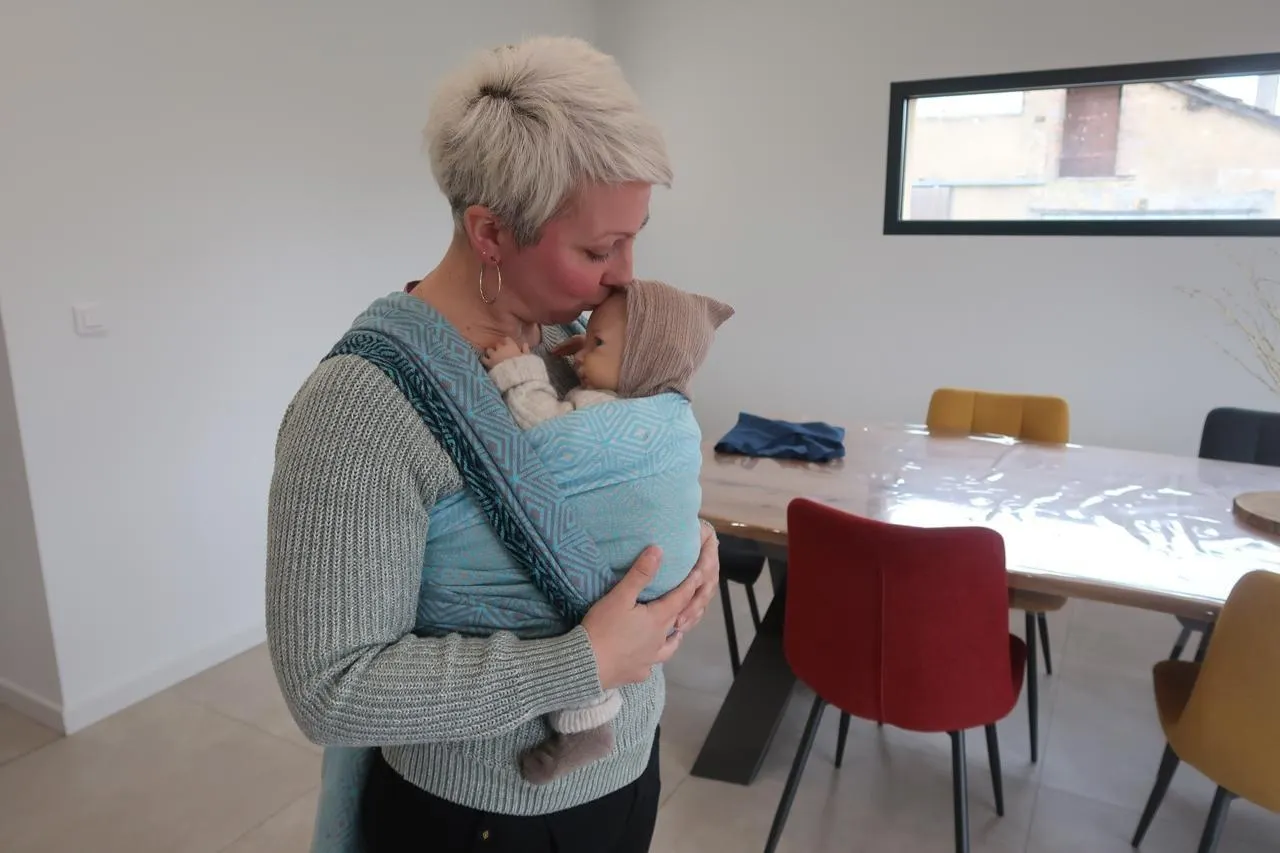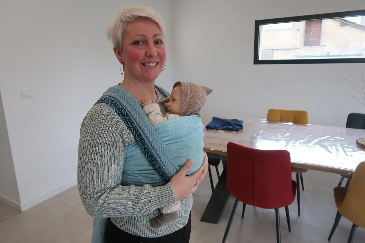 Durtal, le 2 février 2026. Infirmière puéricultrice de formation, Marie Duret se lance en tant qu'accompagnante périnatale. Parmi les outils qu'elle propose, il y a l'initiation au portage. © CO - Agathe LE NUEFF