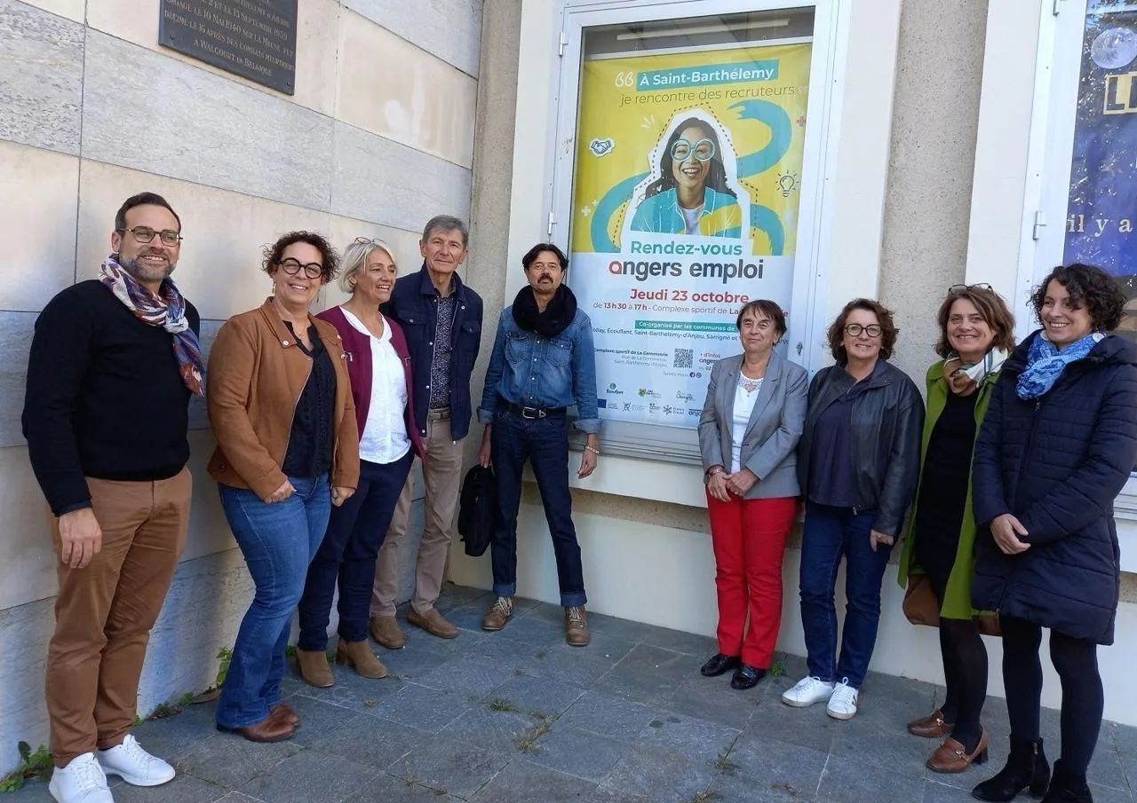 Des représentants des communes de Saint-Barthélemy, Écouflant, Verrières-en-Anjou, de la Mission locale angevine (MLA), de France travail et d’Angers Loire développement (Aldev), tous organisateurs du job dating du 23 octobre. © Ouest-France