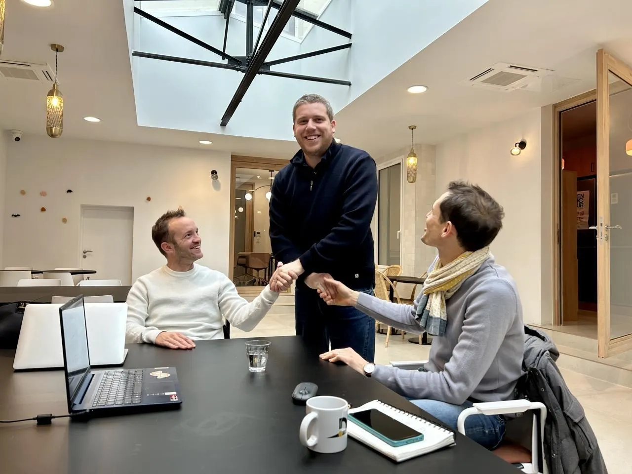 Angers, jeudi 15 janvier 2026. Simon Gérard, cofondateur de WeForge, salue de nouveaux locataires dans l’open space de la gare. © CO – Chloé BOSSARD