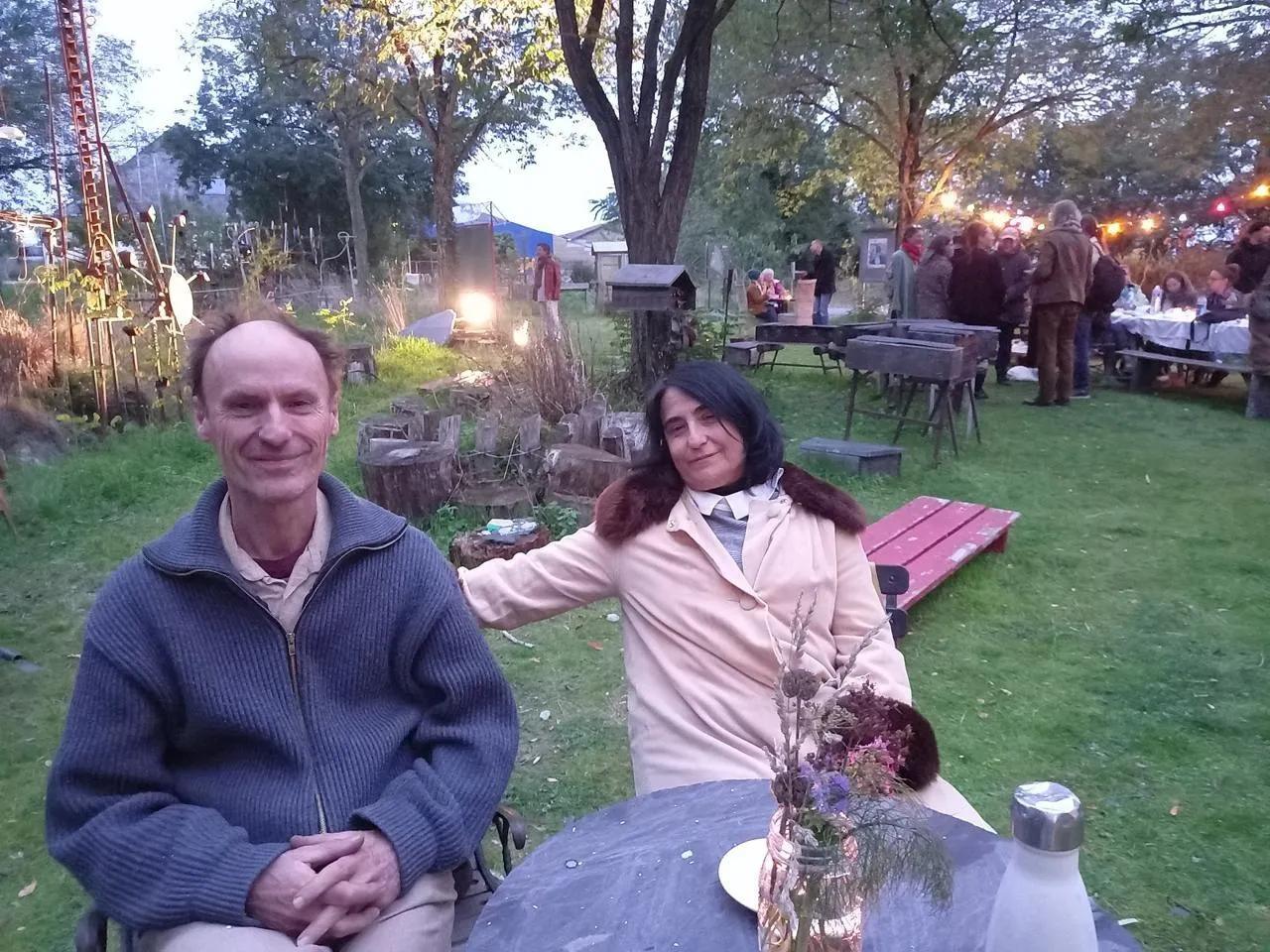 Philippe Lefèbvre, alias Flop, et Loredana Lanciano, deux des artistes du collectif Zur, dans le jardin illuminé, le 26 septembre, avant la présentation d’une étape de leur nouvelle création, Focus. © Ouest-France