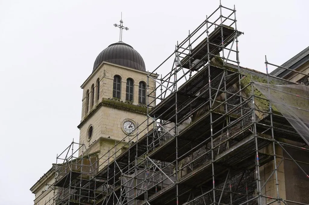 La Bohalle, près d’Angers, le 22 mars 2025. L’église Saint-Aubin (1838-1844), qui s’inspire des modèles de l’antiquité gréco-romaine avec son portique à colonnes doriques, fait l’objet de travaux depuis de nombreuses années. Photo CO - Josselin CLAIR