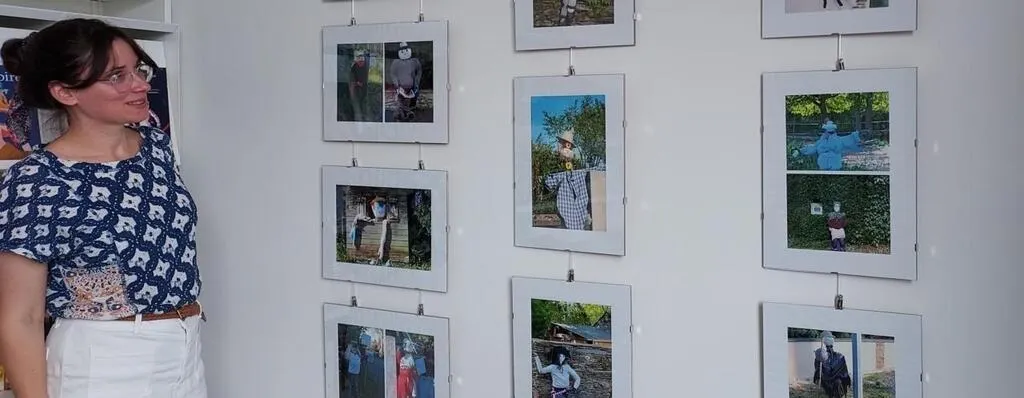 Lucie Baillot a été recrutée par la municipalité, en octobre 2019, pour prendre la responsabilité de la nouvelle médiathèque ouverte en septembre 2020. Elle pose ici devant l’exposition de photos d’épouvantails, prises lors du premier confinement au hameau des Brosses. © Ouest-France