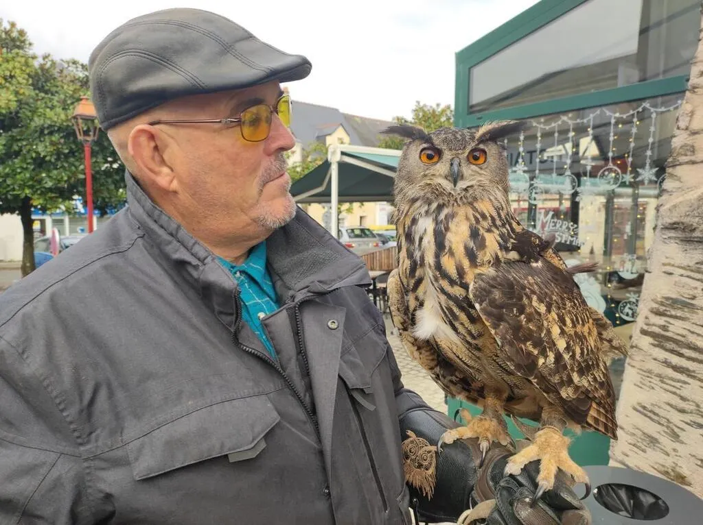 Gilles Fontaine et son hibou grand-duc, nommée « Merline », dans les rues de Candé, mercredi. © Ouest-France
