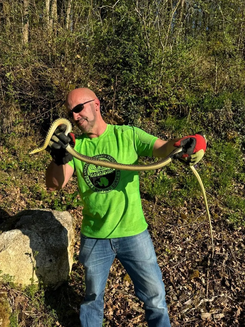 Cyril Michel, vice-président de la Société herpétologique de Touraine, avec une couleuvre verte et jaune. Elle était entrée dans une habitation et elle a été ensuite relâchée dans son habitat naturel proche du lieu de la rencontre. © Société Herpétologique de Touraine