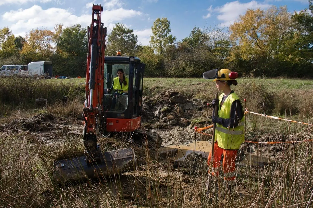 Gwenola aux commandes de la minipelle et Chloé engagées dans la restauration de la mare. © Lycée Le Fresne