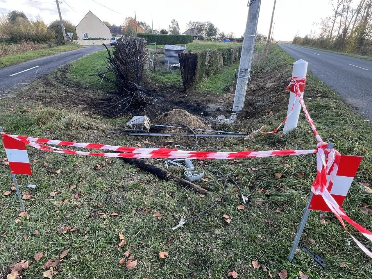 Beaufort-en-Anjou, dimanche 9 novembre 2025. Après avoir mordu l’accotement, le véhicule d’Enzo a basculé dans le fossé avant de terminer brutalement sa course contre un poteau électrique et de s’embraser à l’entrée de l’impasse de la Grande Boire. © Photo CO - Annah BLOUIN-FAVARD