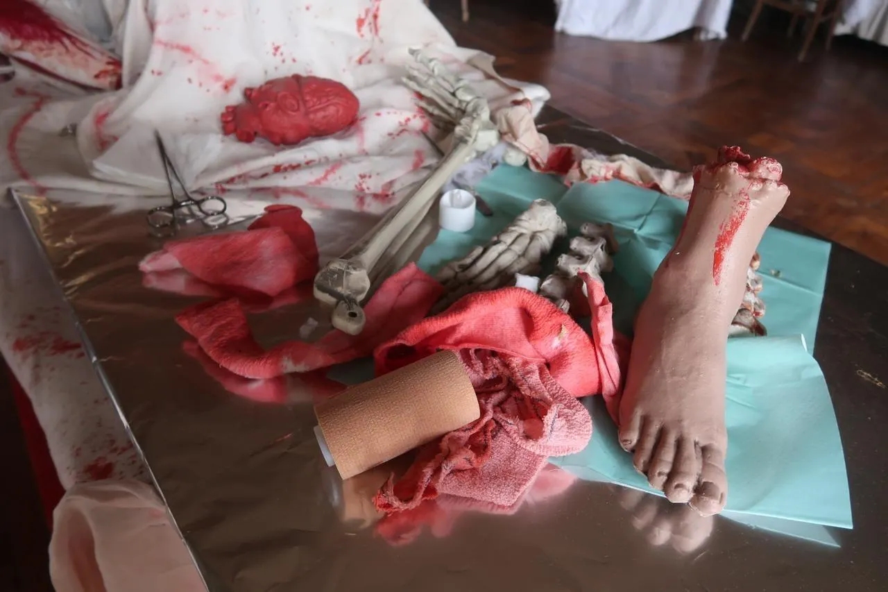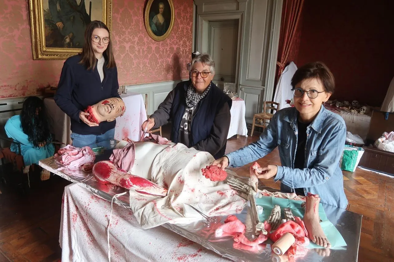 Mazé, le 14 octobre 2025. Louise Chouteau, médiatrice culturelle au château de Montgeoffroy, accompagnée des bénévoles Patricia et Emmanuelle, en pleine préparation des décors de la « murder party ». © CO - Agathe LE NUEFF