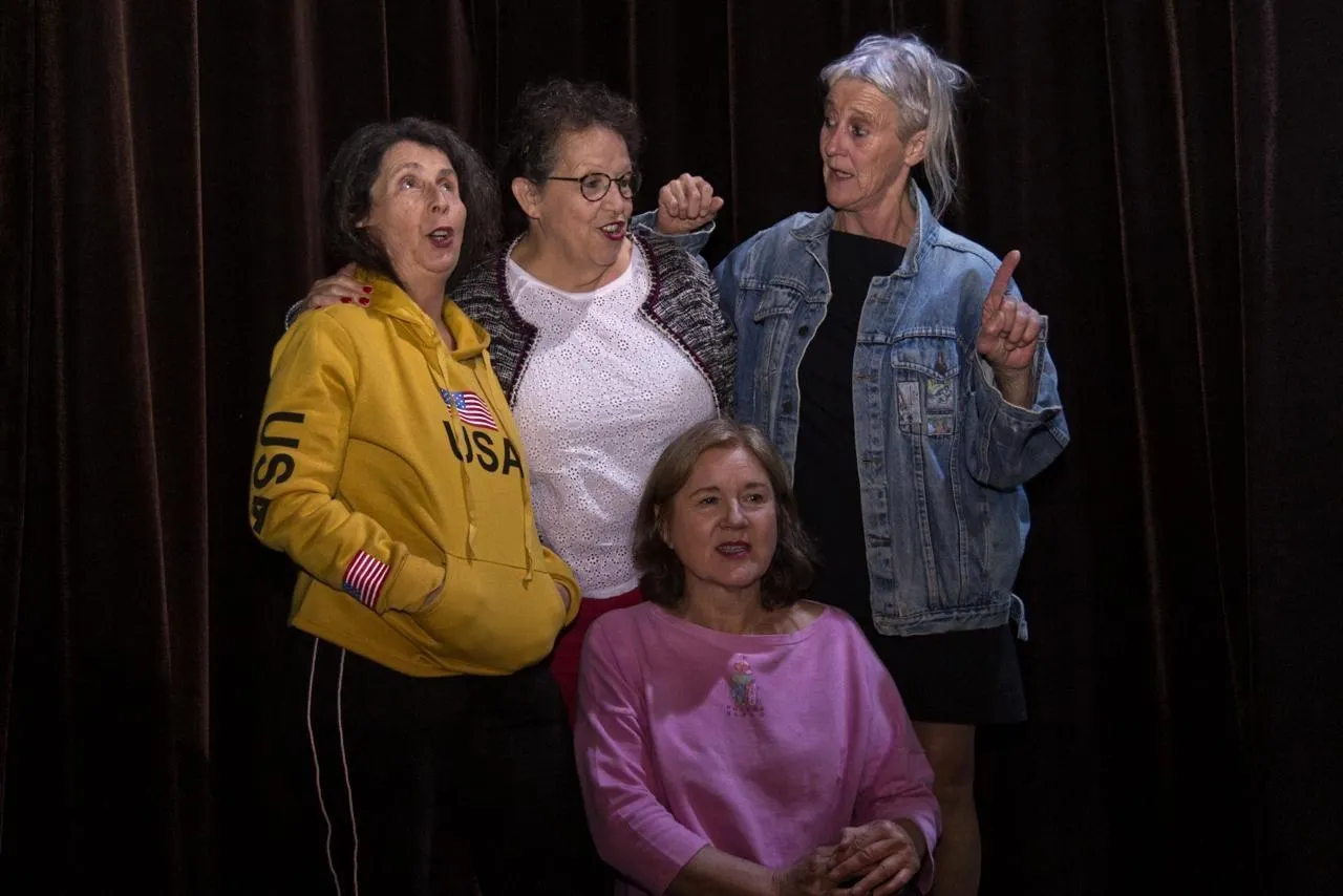Les quatre actrices de La cerise sur le tréteau, de gauche à droite : Jeanne-Marie Côme, Véronique Côme, Catherine Pelé, devant : Eve Blanchard. © Michel Métivier