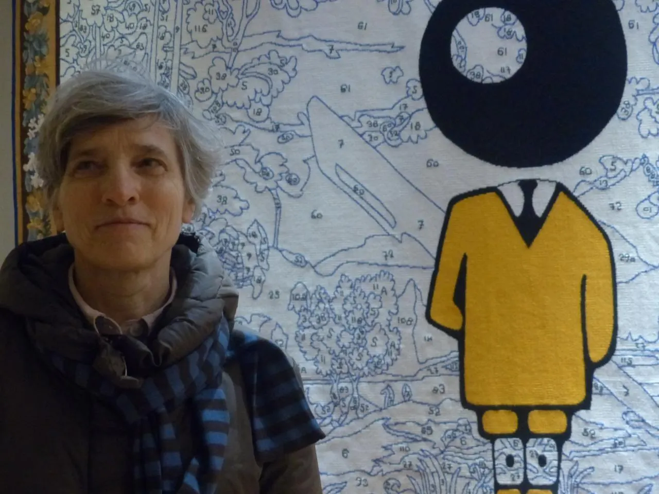 « L’origine précise de ces tapisseries est difficile à établir. Elles inspirent des artistes contemporains comme Philippe Favier et ce tableau, Le Bic émissaire, qui reproduit le Bic Boy logo de l’entreprise, avec le trait du stylo transcrit en laine », détaille la directrice artistique du château Catherine Leroi.