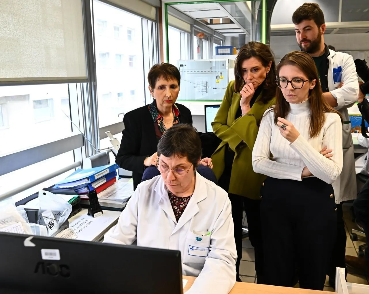 Aurore Bergé, ministre de l’Égalité entre les femmes et les hommes et de la Lutte contre les discriminations, et la députée Sandrine Josso lors de la visite des laboratoires du CHU dans le cadre de l’expérimentation « soumission chimique ». À gauche, la Dr Catherine Monteil-Ganière, et au troisième plan, Edouard Le Carpentier, pharmacien biologiste. © Franck Dubray / Ouest France